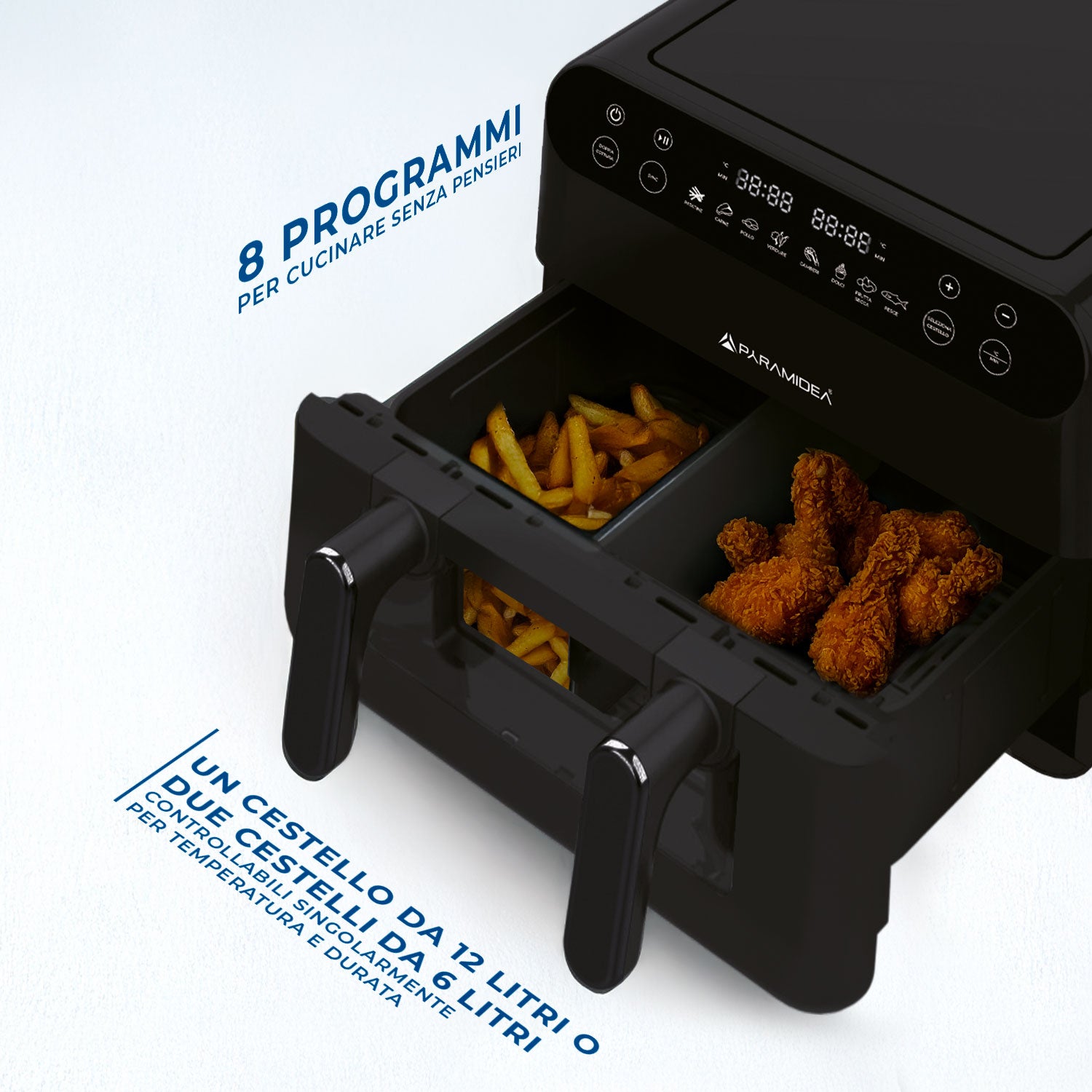 · DOPPIO CESTELLO: 12 litri separabile in 2 parti ciascuna da 6 litri, completamente autonome. Può cuocere contemporaneamente due pietanze diverse, con temperature e tempi di cottura diversi.