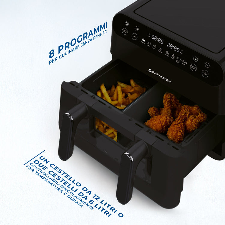 · Friggitrice ad aria con doppio cestello con capacità di 12 litri totali, per preparare diversi pasti completi preparati in una sola volta, da 2 a 10 persone