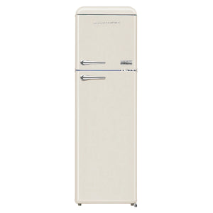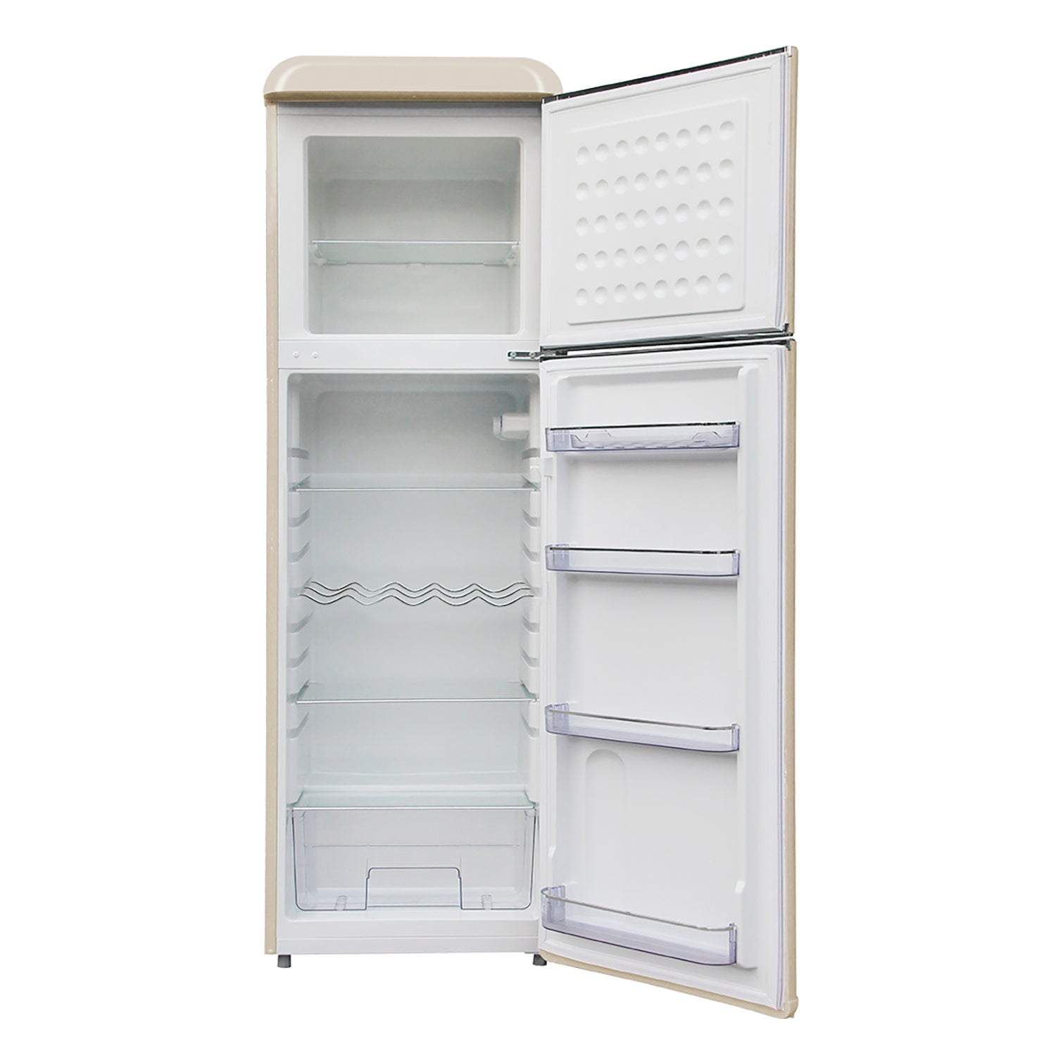 Frigorifero e congelatore doppia porta Mambo289C stile retro, 280 litri totali, 205 litri frigorifero, 75 litri congelatore, Piedini regolabili, Nuova classe energetica E, 3 ripiani in vetro, Autonomia in caso di black out 24,5 ore, 4 Balconi, Dim. 55 × 62 × 172 cm. peso 47 Kg. Colore crema.