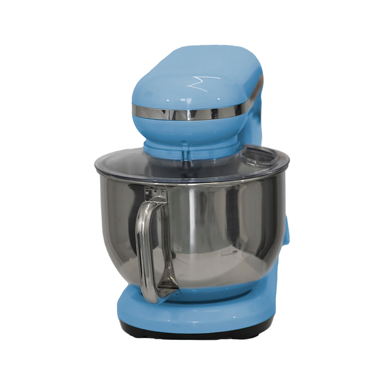 Impastatrice con display digitale, 8 velocità , Timer digitale, Testa sollevabile, potenza 1200 watt max, 6 velocità di rotazione planetaria, funzione pulse, ciotola in acciaio 5,2 litri, Coperchio paraschizzi,sbattitore in acciaio, Gancio impastatore, sbattitore IN TEFLON, Colore Azzurro, Misure 25X33X37,5