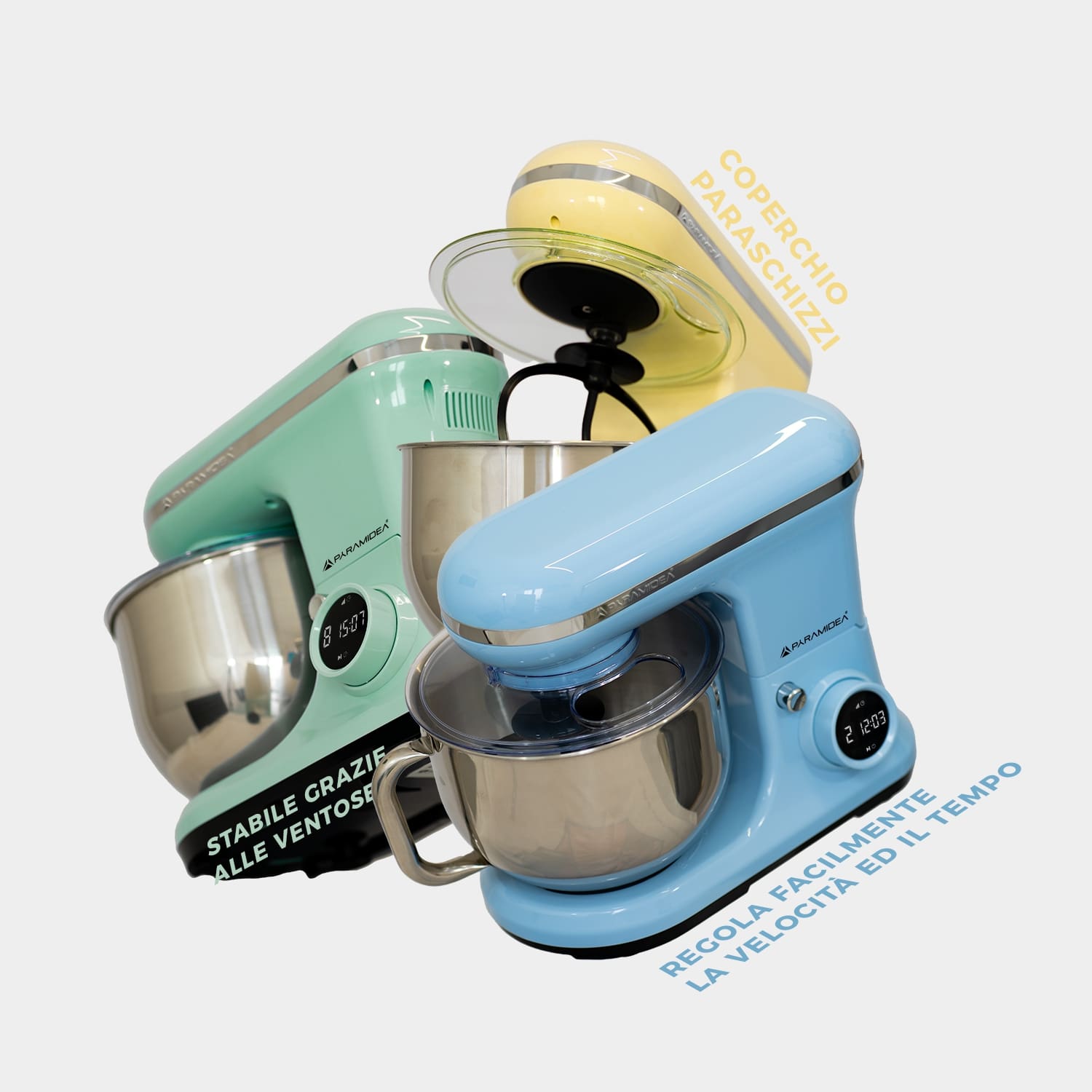 La nuova impastatrice planetaria PYRAMIDEA da 5,2 litri rivoluzionerà il modo di cucinare. Grazie al display digitale ti basterà un tocco e un giro del rotore per gestire tempi e velocità di rotazione delle fruste. Ti sei dimenticato di inserire un ingrediente? Nessun problema! Non servirà fermare e aprire l’impastatrice, ma basterà versarlo dall’apposita apertura sul coperchio paraschizzi della ciotola in acciaio inox da 5,2l, dotata anche di manico per darti maggiore agilità e controllo nel gestire i tuoi preparati.