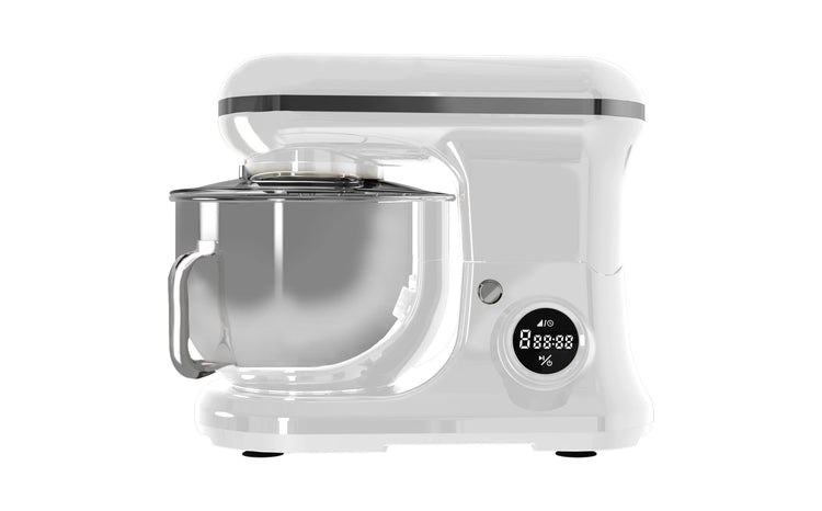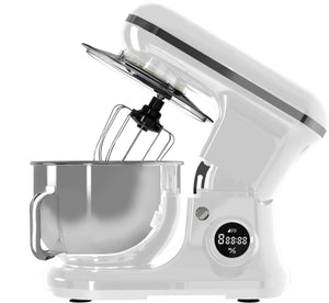 Impastatrice con display digitale, 8 velocità , Timer digitale, Testa sollevabile, potenza 1200 watt max, 6 velocità di rotazione planetaria, funzione pulse, ciotola in acciaio 5,2 litri, Coperchio paraschizzi,sbattitore in acciaio, Gancio impastatore, sbattitore IN TEFLON, Colore Bianco, Misure 25X33X37,5
